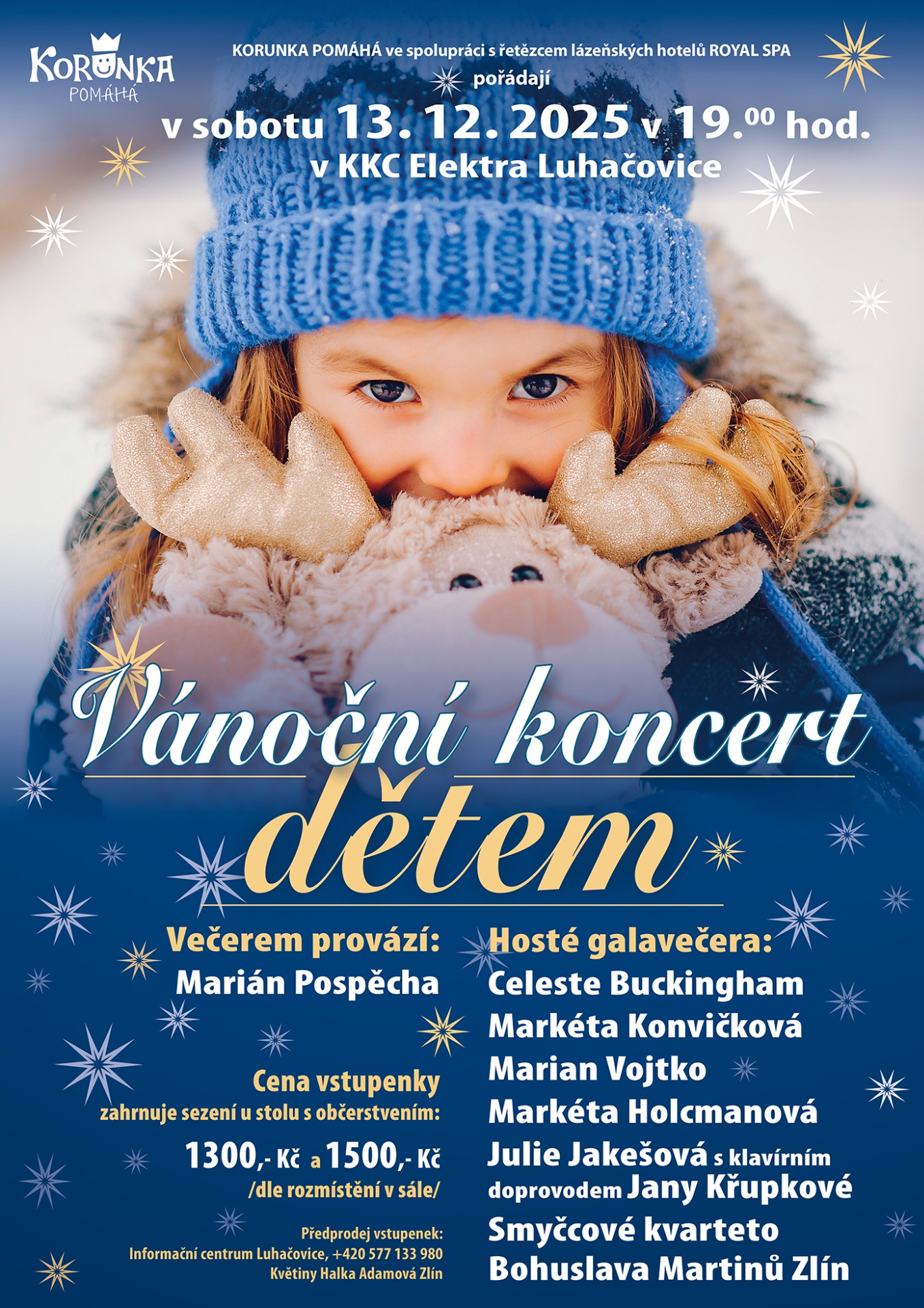 Vánoční koncert dětem opět po roce nebude v Luhačovicích chybět. Už teď KORUNKA finišuje s přípravami a v těchto dnech uveřejňuje program galavečera. Akce se uskuteční v sobotu 13. prosince v Kulturním a kongresovém centru Elektra v Luhačovicích.